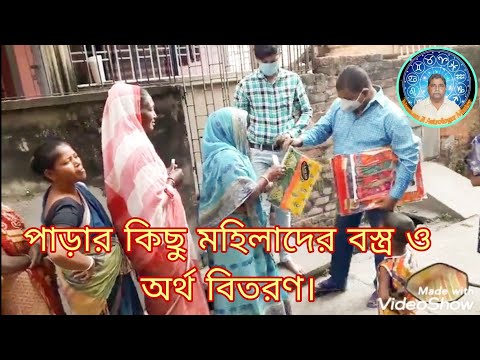 Narayan Ji is giving clothes and money to women in the area adjacent to Tinkonia Sadhumati School on the occasion of Chhot Puja, Purba Burdwan, West Bengal